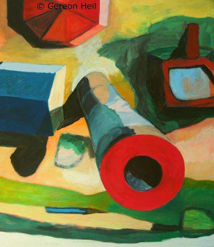 'Architektur und Landschaft habe ich in meinen aktuellen Arbeiten aus dem Blickwinkel der Vogelperspektive gemalt. Einerseits wirken die Dächer der Häuser und die Ringe der Turmenden flächig als abstrakte Farbformen, andererseits erzeugen die auf den Betrachter gerichteten Schlote in ihrer starken Verkürzung und mit ihren Schlagschatten eine ausgeprägte realistische Raumwirkung. Die Sicht von oben erlaubt es, den Horizont an die untere Bildkante zu legen.'