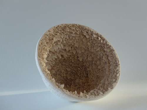 Mein Material ist Steinzeug, Paperclay und Porzellan, bei 1240Grad oxidierend gebrannt.