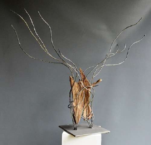 Ikarus 2 ist eine Edelstahlskulptur im Symbiose mit Treibholz.