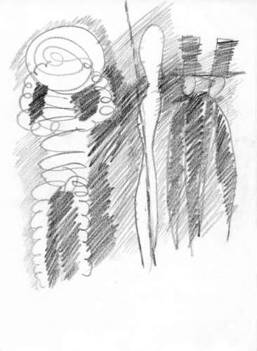 3. Bleistiftzeichnung: Der Rabbi mit Silberschale, Sarah und zwei Fremden