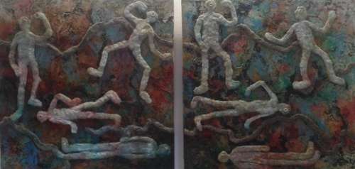 Foto 2 ist eine Arbeit zur Gemeinschaftsausstellung 'Vier Elemente'. Bestehend aus einer Mischtechnik von Papier, Tusche, Ölfarben und Knetepoxy. Titel 'Leben'