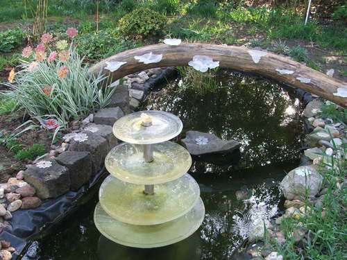 Bild 3: Brunnen: Vollverschmelzung 850 Grad, gebogen u. gebohrt, Durchmesser der Schalen, 50 cm, 40 cm, 30 cm. Im Hintergund: Baumpilze in Pate de Verre Technik. Blumen einfache Verschmelzung 820 Grad.