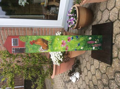 Reizvoll ist für mich das Arbeiten auf ungewöhnlichen Bildträgern, z.B. alten Schranktüren, verwitterten Holzbalken, Schaltafeln und selbst angefertigten Holzstelen.